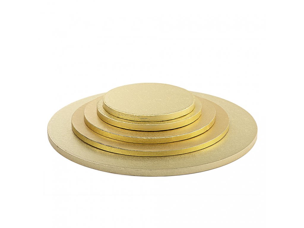 Pevná kulatá dortová podložka, vyrobena z kartonu, potažena světle zlatou fólií.