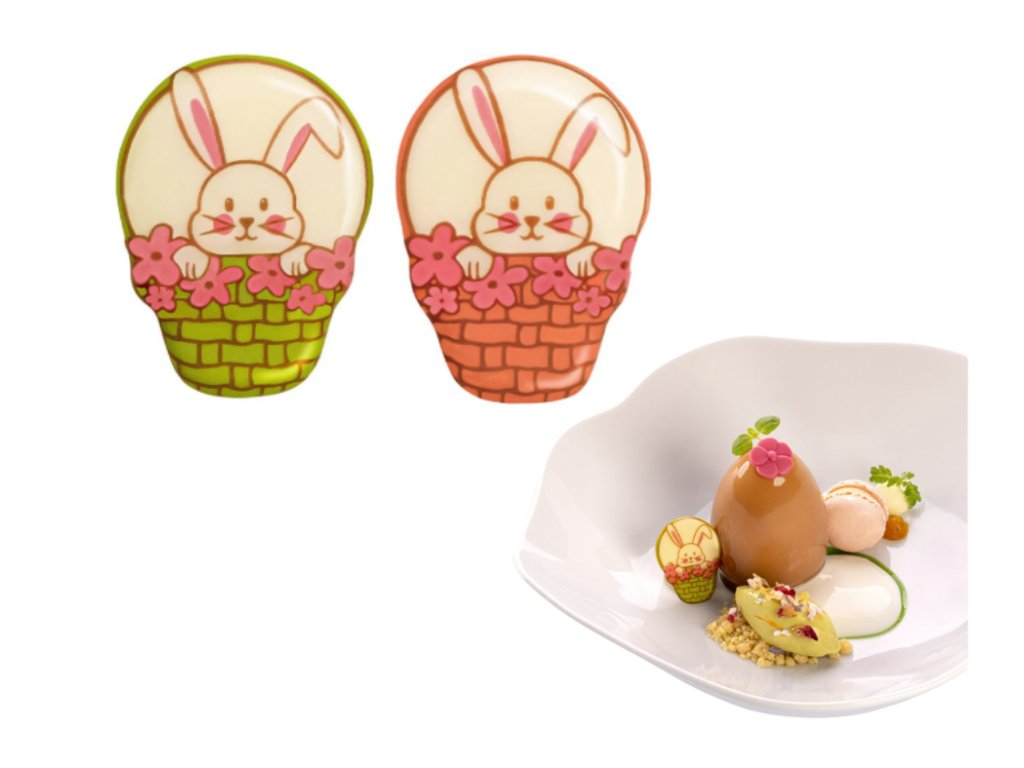 Bunny Baskets“ je sada čokoládových dekorací v různých barvách, inspirovaná klasickým velikonočním motivem, o rozměrech 25 × 35 mm. Pečlivě propracované tvary a harmonická barevná paleta dodávají dekoracím elegantní a nadčasový charakter, díky čemuž se dokonale hodí k jubilejní velikonoční kolekci.