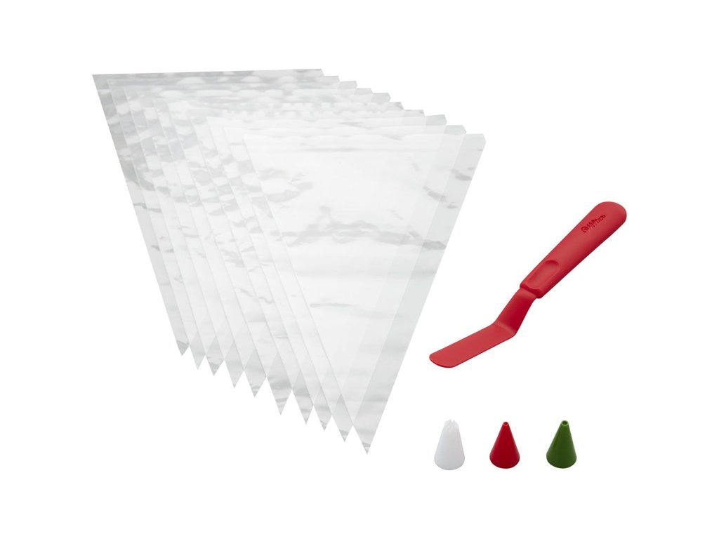 Obsah: 1 šikmá špachtle (22,8 cm), 3 zdobicí špičky (kulatá č. 2, kulatá č. 5, otevřená hvězda č. 21) a 10 zdobicích sáčků (30 cm).