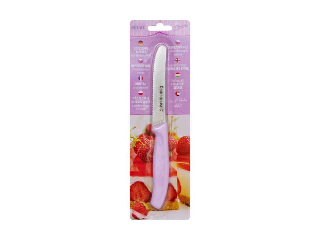 Nůž s vroubkovaným ostřím. Nůž je vyroben z kvalitní oceli a disponuje ergonomickou plastovou rukojetí. Je snadno omyvatelný a může se mýt v myčce.
