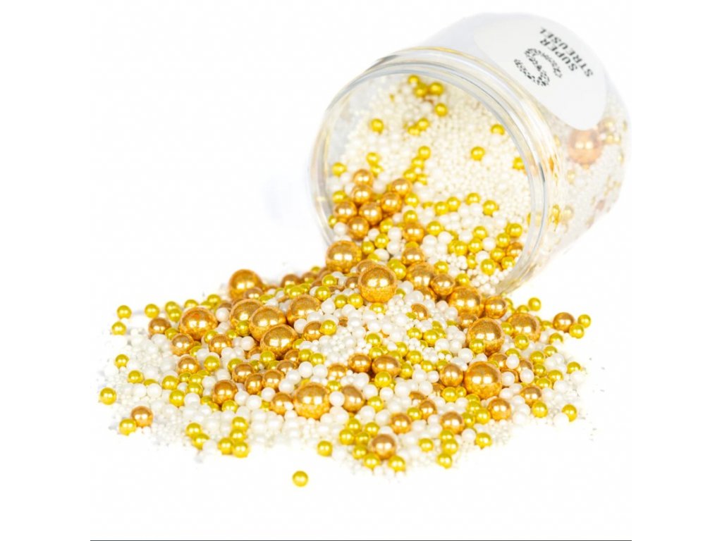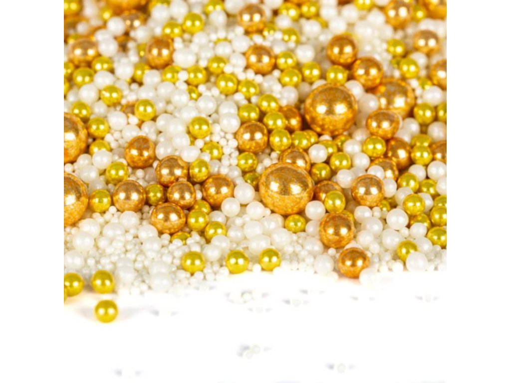 Zdobení obsahuje bílé, zlaté kuličky různých průměrů.