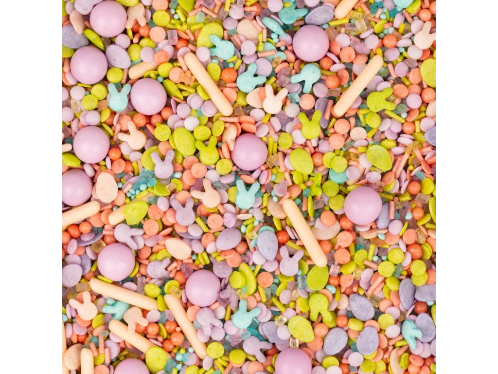 Zdobení obsahuje: konfety v barvě fialová, zářivě broskvová a trávově zelená, čokoládové kuličky v fialové barvě a cukrové tyčinky v broskvové barvě, různobarevné hlavičky králíků a sladká velikonoční vajíčka.