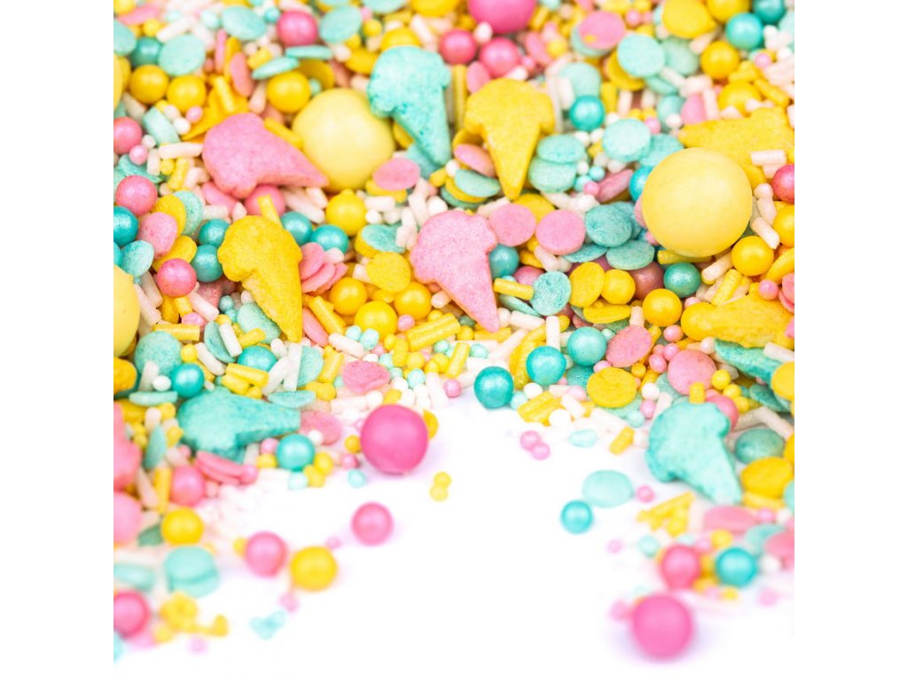 Zdobení obsahuje cukrové růžové, žluté a tyrkysové zmrzliny a kuličky, tyčinky, větší čokoládové žluté a růžové kuličky a spoustu pastelových konfet.