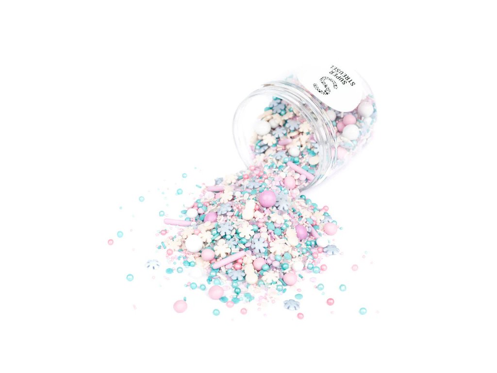 Zdobení obsahuje sněhové vločky, cukrové tyčinky, čokoládu a křupavé kuličky, malé konfety a posypku v pastelových barvách vánočního období: nebesky modré, jemně růžové a sněhově bílé.
