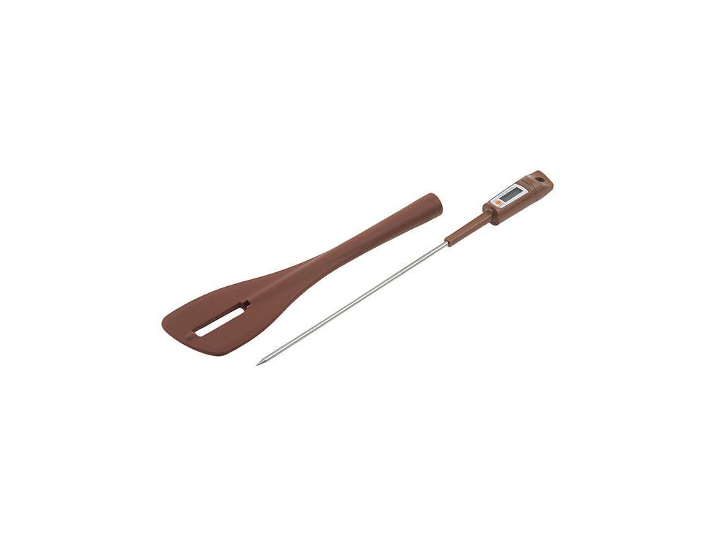 Thermo Choc od Silikomartu je silikonová špachtle s teploměrem pro kontrolu teploty (od -40°C do 160°C/-40°F až 320°F) rozpuštěné čokolády, krémů, omáček, džemů, sirupů na italský způsob pusinky atd.