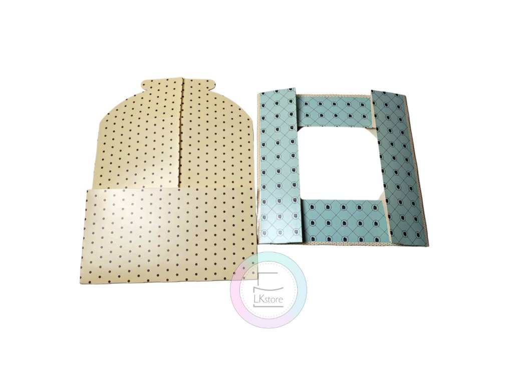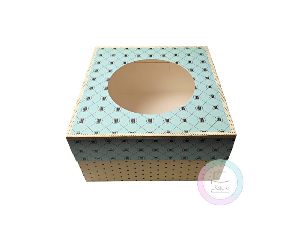 Dortové krabice béžovo-modré s okénkem.