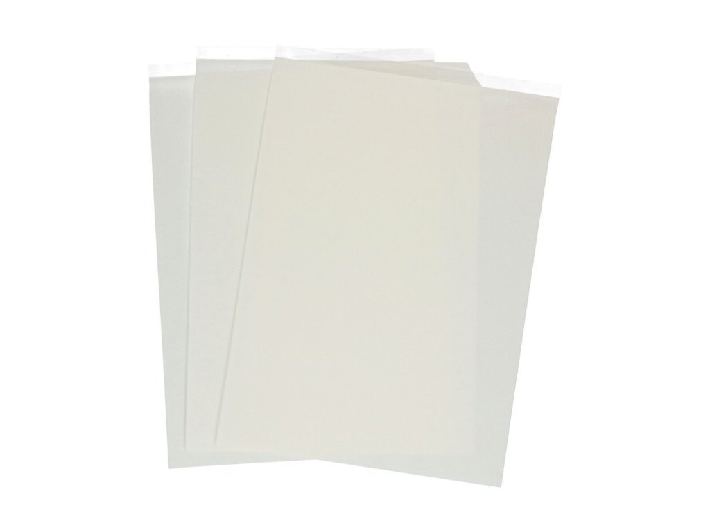 Velikost: A4 (21 x 29,7 cm). Tloušťka je 0,5 - 0,6 mm bez vrstvy nosného plastu, na kterém leží list.