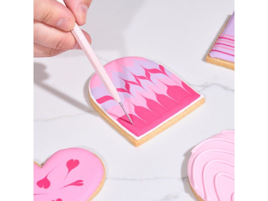 Tento nástroj je ideální pro odstraňování vzduchových bublin, opravu malých nedokonalostí, umístění posypky, mramorování polevy a přidávání jemných detailů. Je všestrannou nezbytností pro detailní zdobení.