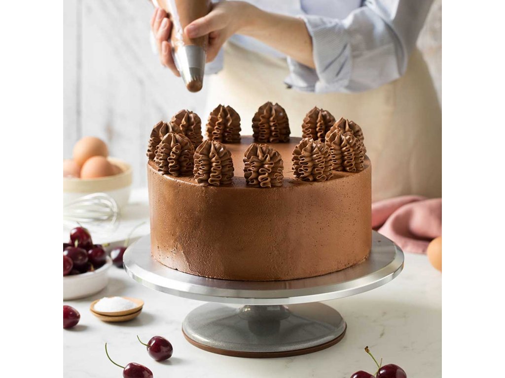 Stojánek na dort vyrobený z vysoce kvalitního hliníku, odolný vůči dlouhodobému používání.