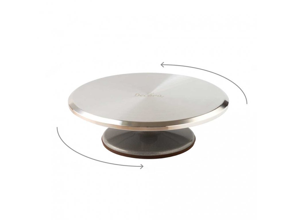 S velkou nosnou plochou, otočnou v obou směrech (vpravo / vlevo), vybavena třemi drážkami pro zajištění správného umístění dortu na podložce.