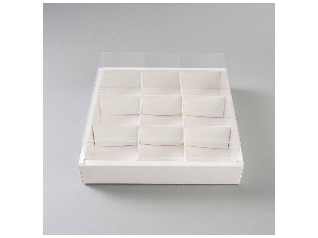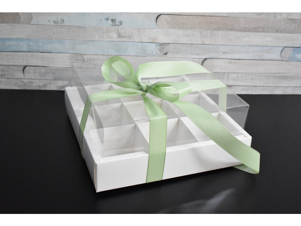 Cukrářská krabice s průhledným víkem a dělící vložkou.