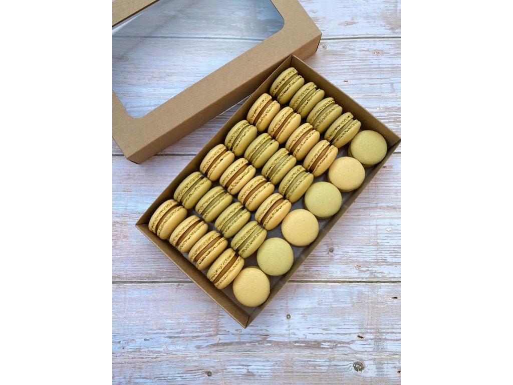 Dvoudílná krabice s oknem vhodná na makronky a jiné cukroví, čajové pečivo nebo dárky.