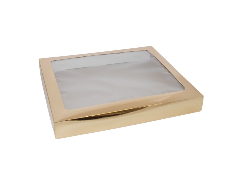 Víko má zlatý lesklý povrch, spodní díl je bez potisku. Okénko je podlepeno PP folií. Vnitřní strana je z potravinářské bílo bílé lepenky s úpravou proti promaštění.