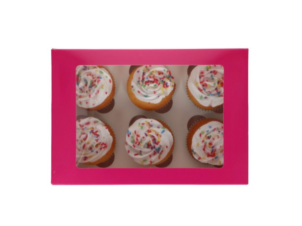 Každá pevná kartonová krabička má průhledné okénko, které krásně vystaví vaše dobroty – a je také ideální jako dárek! Krabička pojme 6 cupcakes standardní velikosti a obsahuje vložku, která zabraňuje jejich posunutí během přepravy. Navíc obdržíte samostatnou vložku na 12 mini cupcakes.