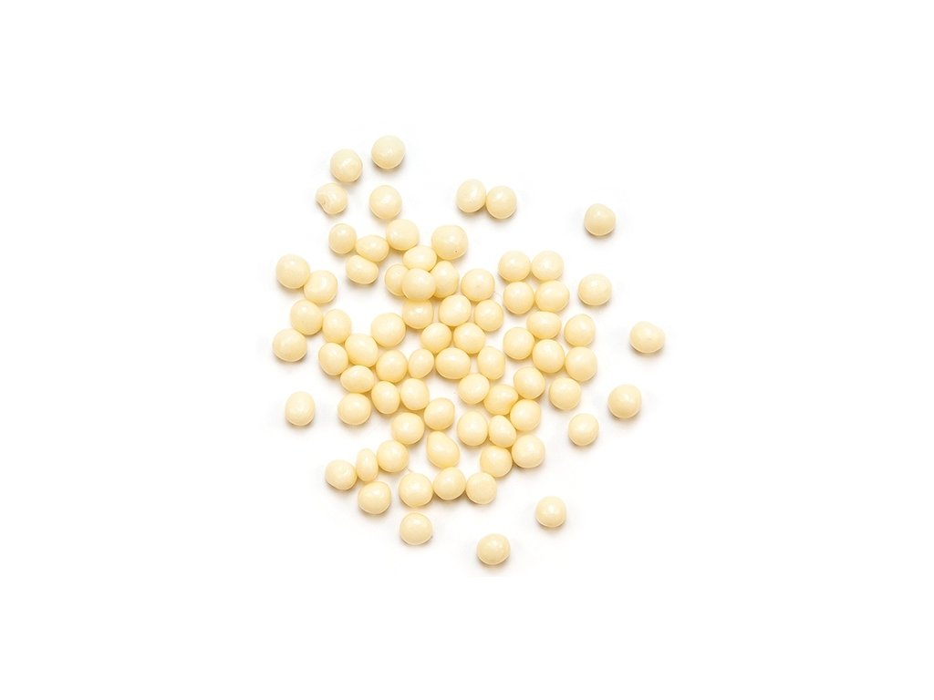 Extrudované kuličky +-4 mm z rýžové mouky obalené v bílé čokoládové polevě.