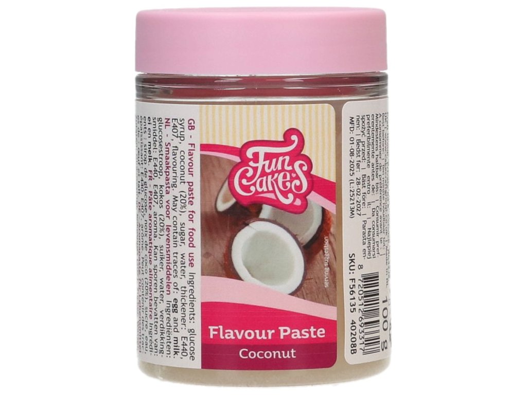 Tato ochucovací pasta s příchutí kokosu FunCakes má lahodnou ovocnou příchuť a jsou ideální pro doplnění chuti krému, zmrzliny a různých náplní.