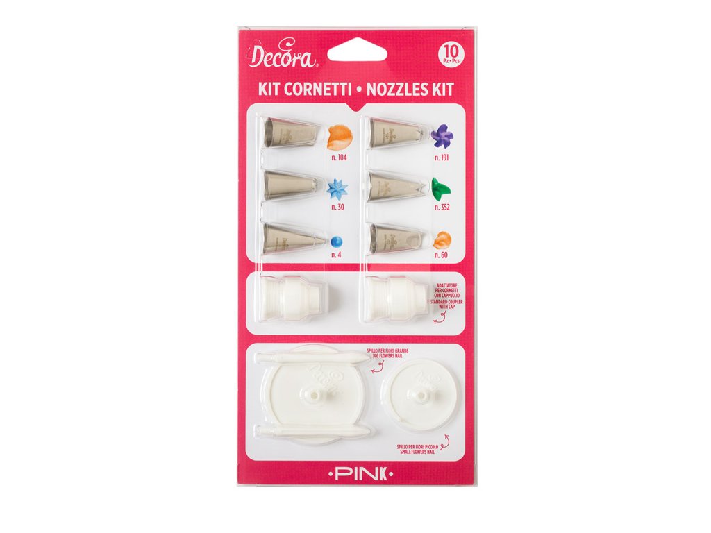 Sada obsahuje: 2 adaptéry s uzávěry, 1 malý stojan na květiny, 1 velký stojan na květiny, zdobící špičky číslo 104, 30, 4, 191, 352, 60.