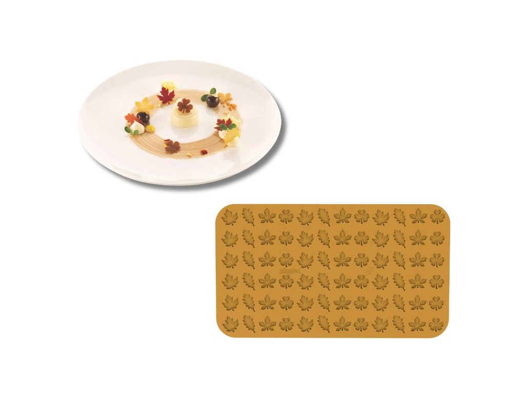 Silikonová podložka s dutinami ve tvaru listu umožňuje vytvářet tenké, rafinované dekorace v podobě paštiky z cigaret i čokolády, ideální pro ozdobení dezertů na talíři, jednotlivých porcí a gurmánských kreací.