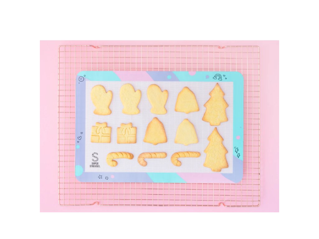 A vaše podložka SuperBaking Mat dokáže ještě víc: Je tepelně odolná až do 220 stupňů Celsia a neobsahuje BPA ani PFAS. Můžete ji použít jako opakovaně použitelný pečící papír a například na ní péct sušenky. Je také super praktická: Je to ideální protiskluzový povrch pro hnětení a válení těsta nebo fondánu.