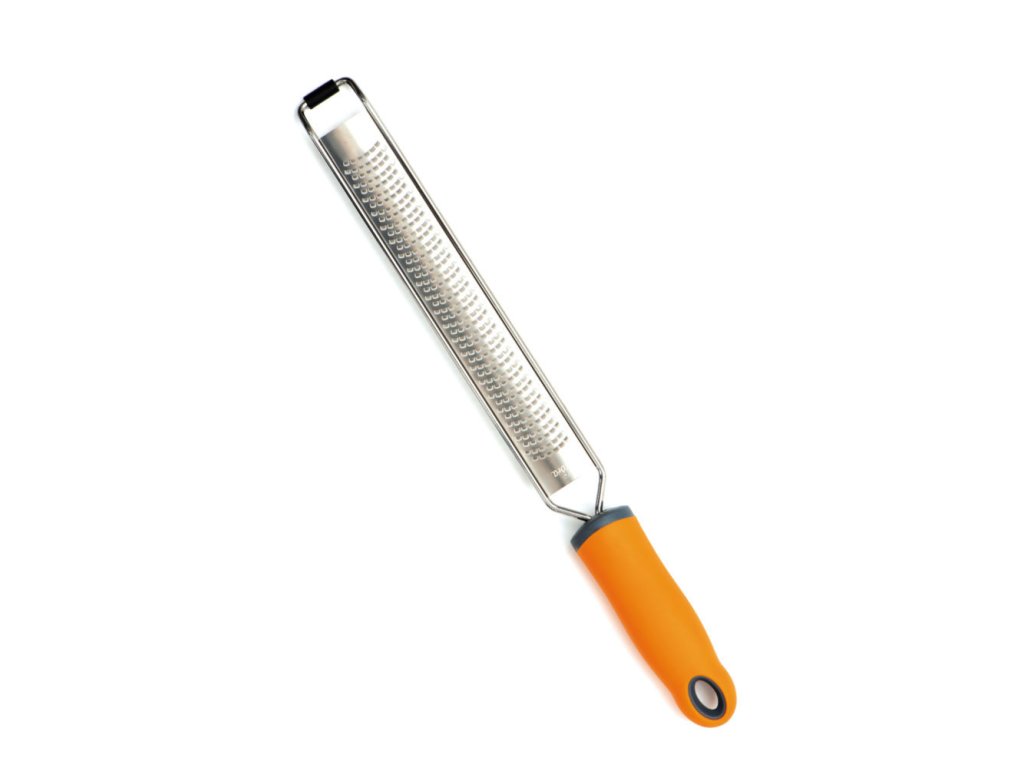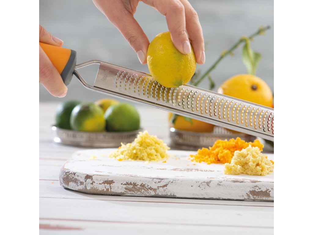 Kuchyňské nádobí s čepelí z nerezové oceli, protiskluzovou podporou a ergonomickou rukojetí. Nezbytné pro jakýkoli druh kulinářské přípravy. Jemná čepel vám umožní získat tenké vločky: je ideální pro strouhání sýrů, koření, jako je muškátový oříšek, skořice a hřebíček, a pro všechny druhy citrusové kůry.