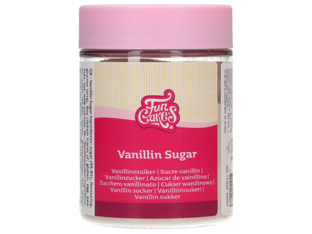 Vanilinkový cukr FunCakes je cukr s vanilkovou příchutí. Přidejte ho do těsta a dodáte lahodnou vanilkovou chuť všem druhům dortů nebo dezertů. Lze jím také posypat čerstvé ovoce nebo palačinky.